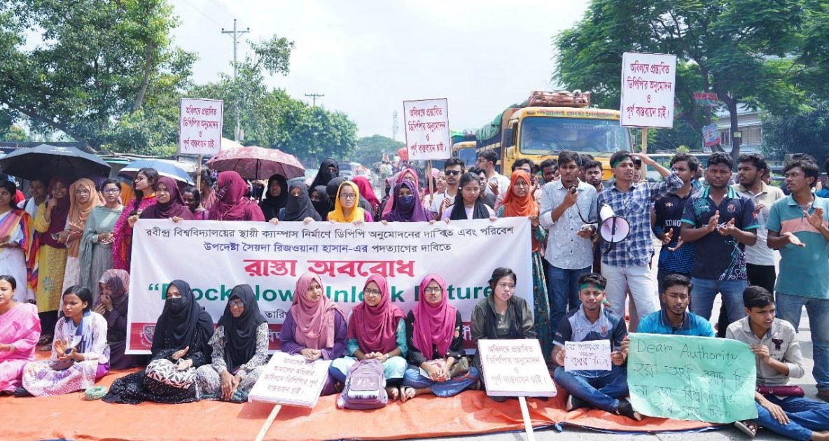 রবীন্দ্র বিশ্ববিদ্যালয়ের স্থায়ী ক্যাম্পাস নির্মাণে ডিপিপি’র দ্রুত অনুমোদন ও পূর্ণ বাস্তবায়নের দাবিতে রবিবার সকালে সিরাজগঞ্জের শাহজাদপুর উপজেলার বিসিক বাসস্ট্যান্ডে মানববন্ধন করেন বিশ্ববিদ্যালয়ের শিক্ষক, শিক্ষার্থী, কর্মকর্তা ও কর্মচারীবৃন্দ; শাহজাদপুরের বিভিন্ন রাজনৈতিক ও সামাজিক সংগঠনের নেতাকর্মী এবং বিভিন্ন শিক্ষা প্রতিষ্ঠানের শিক্ষক ও শিক্ষার্থীরা। তাদের প্রতি সংহতি জানিয়ে মানববন্ধন ও বিক্ষোভ প্রদর্শন করেন নাসিম উদ্দিন মালিথা পরিষদের নেতৃবৃন্দ; বাংলাদেশ জামায়াত ইসলামী, শাহজাদপুরের নেতৃবৃন্দ; শাহজাদপুর সচেতন নাগরিক ফোরামের নেতৃবৃন্দসহ বিভিন্ন শিক্ষা প্রতিষ্ঠানের শিক্ষক ও শিক্ষার্থীগণ। সকাল ১০:১৫ মিনিটে আন্দোলনকারীরা বিসিক বাসস্ট্যান্ড সংলগ্ন ঢাকা-পাবনা মহাসড়ক অবরোধ করে রবীন্দ্র বিশ্ববিদ্যালয়ের স্থায়ী ক্যাম্পাস নির্মাণের দাবিতে বিক্ষোভ প্রদর্শন করতে থাকে।