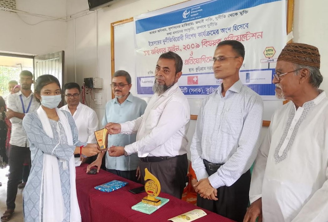 কুড়িগ্রাম সরকারি কলেজের শতাধিক তরুণ শিক্ষার্থীকে তথ্য অধিকার আইন, ২০০৯ বিষয়ে ধারণা প্রদান করেছে সচেতন নাগরিক কমিটি (সনাক)। আজ সকালে কলেজের দর্শন বিভাগের হলরুমে অনুষ্ঠিত এ কর্মসূচিতে শিক্ষার্থীদের আইনটির গুরুত্ব, তথ্য প্রাপ্তির প্রক্রিয়া ও অভিযোগ দায়েরের নিয়মাবলি হাতে-কলমে জানানো হয়। এর পর শিক্ষার্থীদের অংশগ্রহণে তথ্য অধিকার আইন, ২০০৯ বিষয়ে কুইজ প্রতিযোগিতা অনুষ্ঠিত হয়।কার্যক্রমে প্রায় ১৫০ জন শিক্ষার্থী অংশগ্রহণ করে ।