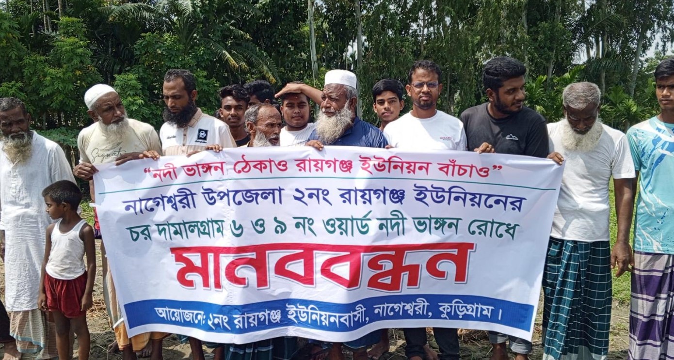সোমবার (২২ সেপ্টেম্বর) দুপুরে ভাঙন রোধে দ্রুত পদক্ষেপ নেয়ার দাবিতে চর দামালগ্রাম উত্তর তীর সংলগ্ন নদী তীরে মানববন্ধন করেছেন ক্ষতিগ্রস্ত মানুষজন। রায়গঞ্জ ইউনিয়নের ৬ ও ৯ নম্বর ওয়ার্ডের ব্যানারে শতাধিক মানুষ এতে অংশ নেন।