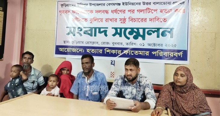 কুড়িগ্রামের উলিপুর উপজেলার বেগমগঞ্জে গৃহবধূ ফাতেমাকে দলবদ্ধ ধর্ষণের পর গলাটিপে হত্যা করে ফাঁসিতে ঝুলিয়ে রাখার অভিযোগ তুলে দৃষ্টান্তমূলক বিচারের দাবিতে সংবাদ সম্মেলন করেছে নিহতের পরিবার। বুধবার (১ অক্টোবর ২০২৫) সকালে কুড়িগ্রাম প্রেস ক্লাবে এ সংবাদ সম্মেলন অনুষ্ঠিত হয়। সংবাদ সম্মেলনে নিহতের স্বজনরা উপস্থিত ছিলেন।