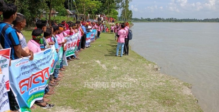 নদী ভাঙ্গনে আর ঠিকানা বদল করতে চাই না, নদী ভাঙ্গন থেকে বাঁচতে চাই, পার্বত্য বিষয়ক মন্ত্রণালয়ের মতো চর বিষয়ক মন্ত্রণালয়ের দাবিতে কুড়িগ্রামের কচাকাটা থানার কেদার ইউনিয়নের দুধকুমার নদের তীরে টেপারকুটিতে মানববন্ধন ও সমাবেশ অনুষ্ঠিত হয়েছে।